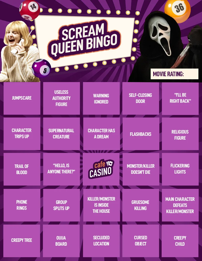 You’ll cross off squares for classic horror tropes like the group splitting up (why do they never learn?) or the moment someone trips while running from danger. Spot the ominous creepy tree swaying in the wind or the chilling silence before a jump scare. And, of course, no scary movie is complete without the villain “dying” only to rise again for one last terrifying showdown.