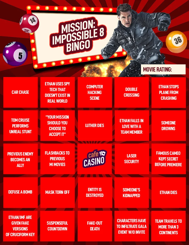 The new Mission Impossible movie, The Final Reckoning, is coming out on May 23, with the daring Tom Cruise leaping back on screen as the unstoppable Ethan Hunt. While Ethan defuses bombs, battles villains, and saves the world in impossible ways, you can perform the much easier stunt of watching the film and crossing off key moments on your bingo card.