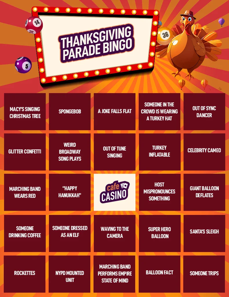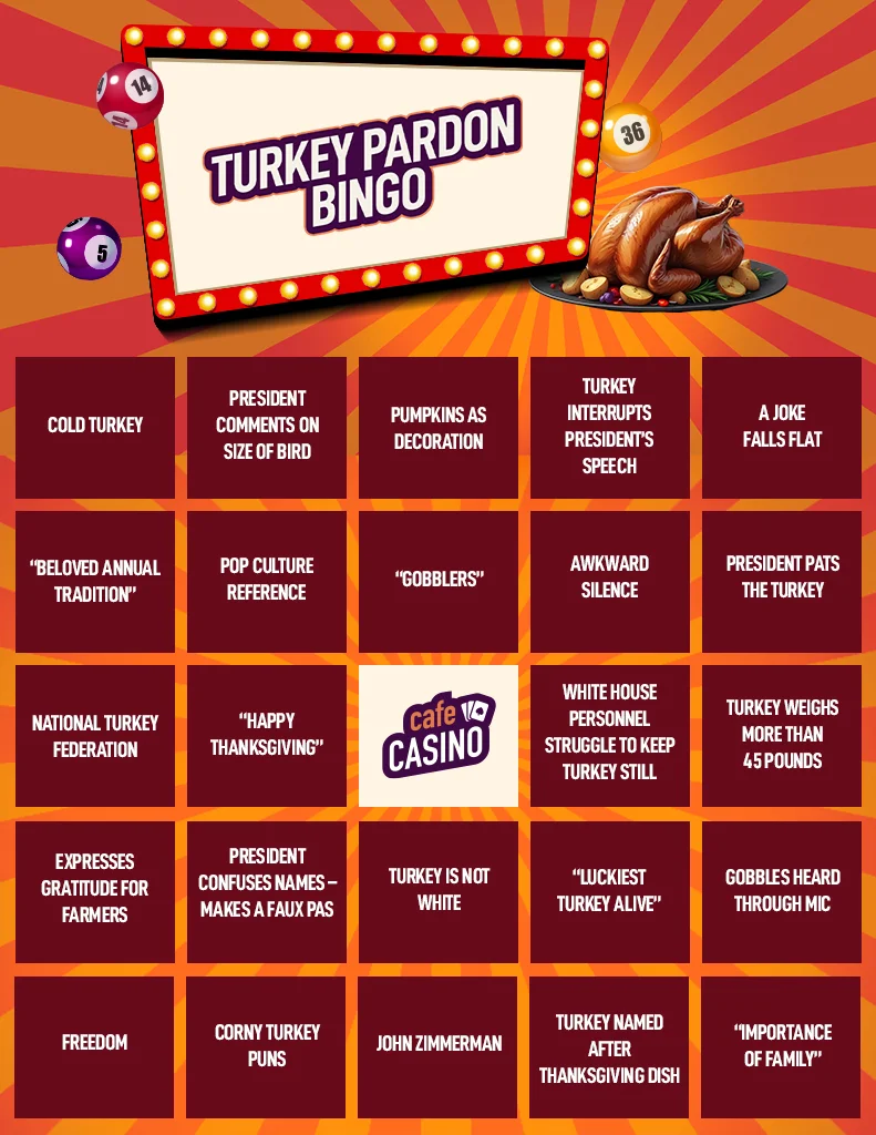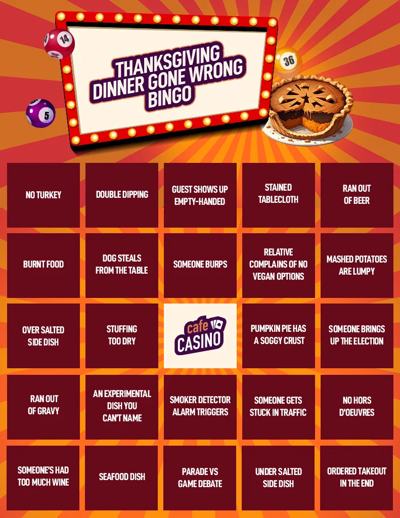 Before you slip into a gravy-induced nap, don’t forget the fun doesn’t have to stop at printable bingo cards for Thanksgiving. Play real bingo at Cafe Casino and turn the holiday energy into actual winnings. Grab your phone, play a card, and let’s call that the true Thanksgiving leftovers. And hey – choke down a spoonful of Aunt Linda’s green Jell-O casserole while you’re at it. Some traditions are just too weird to skip.